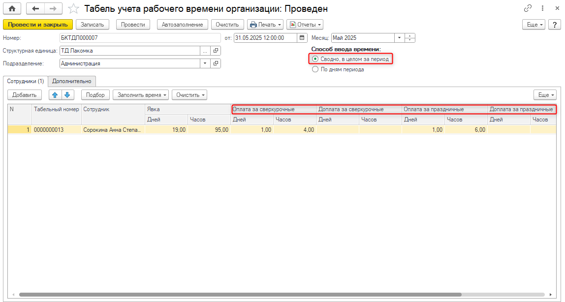 соответствующих колонок — «Оплата за сверхурочные», «Доплата за сверхурочные»,