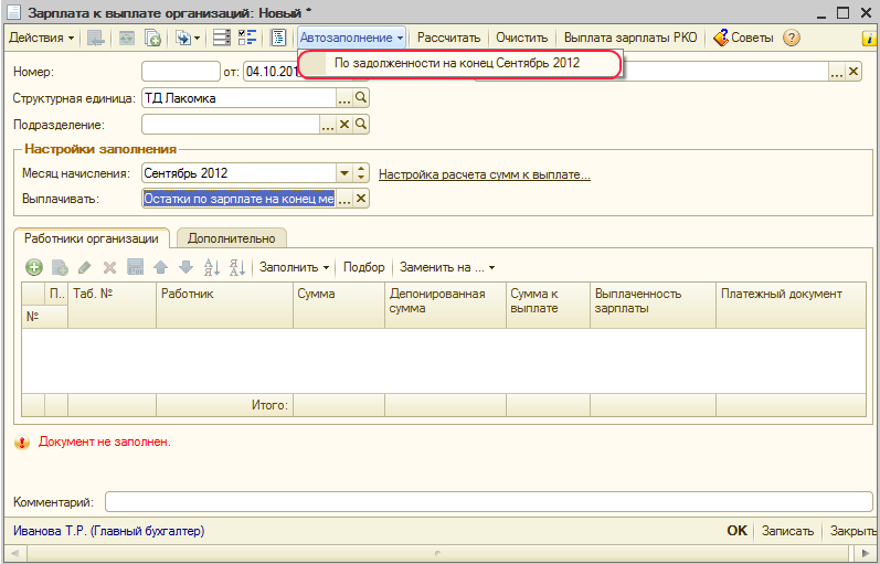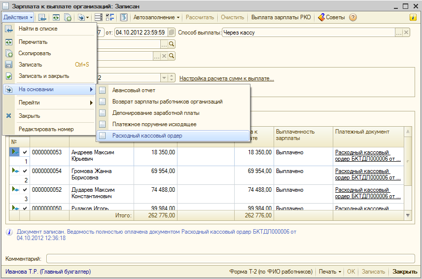 Для того, чтобы выплатить зарплату работникам необходимо: подготовить платежную ведомость на выплату зарплаты. Для этого необходимо создать новый документ «Зарплата к выплате организации»